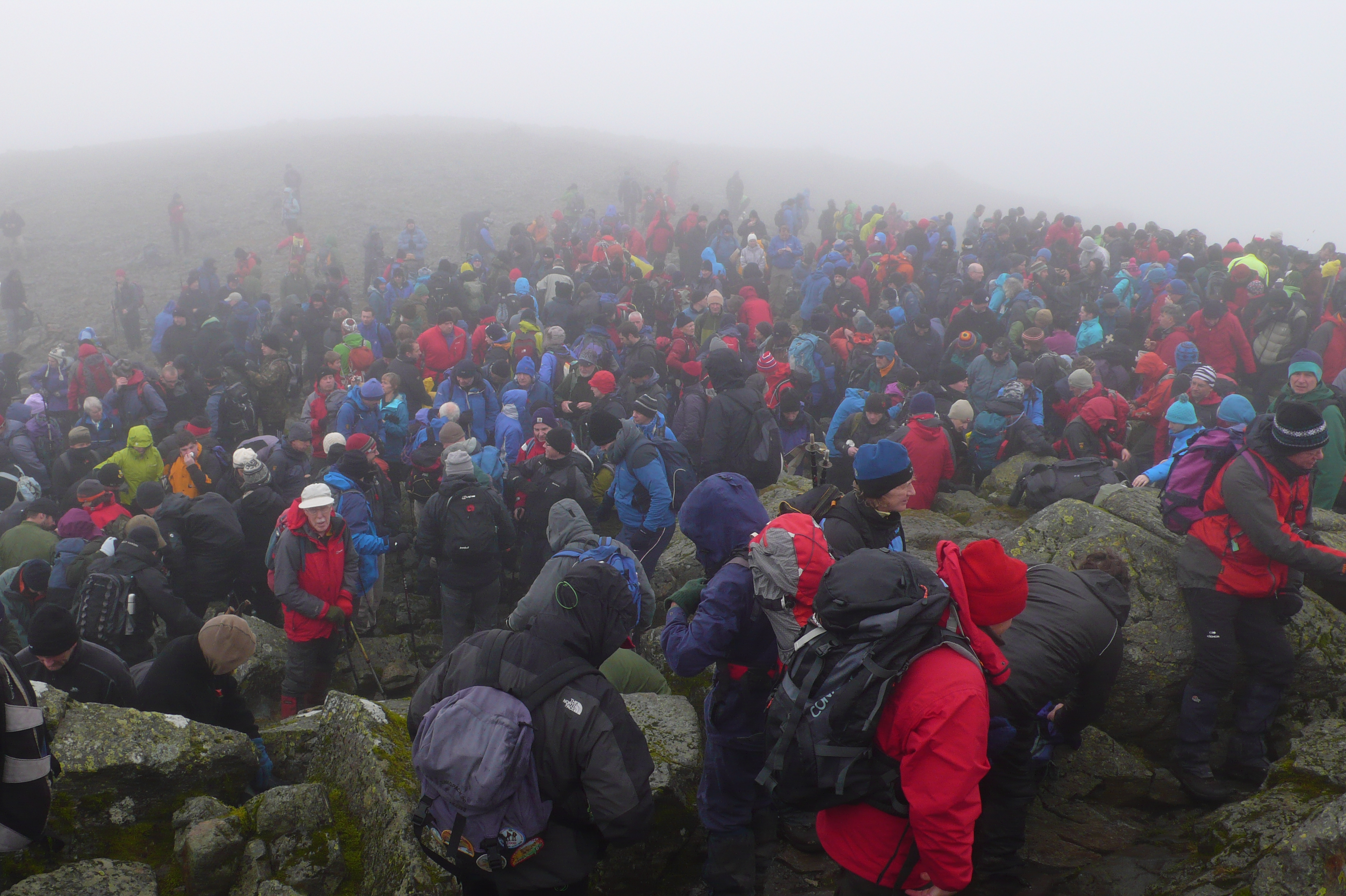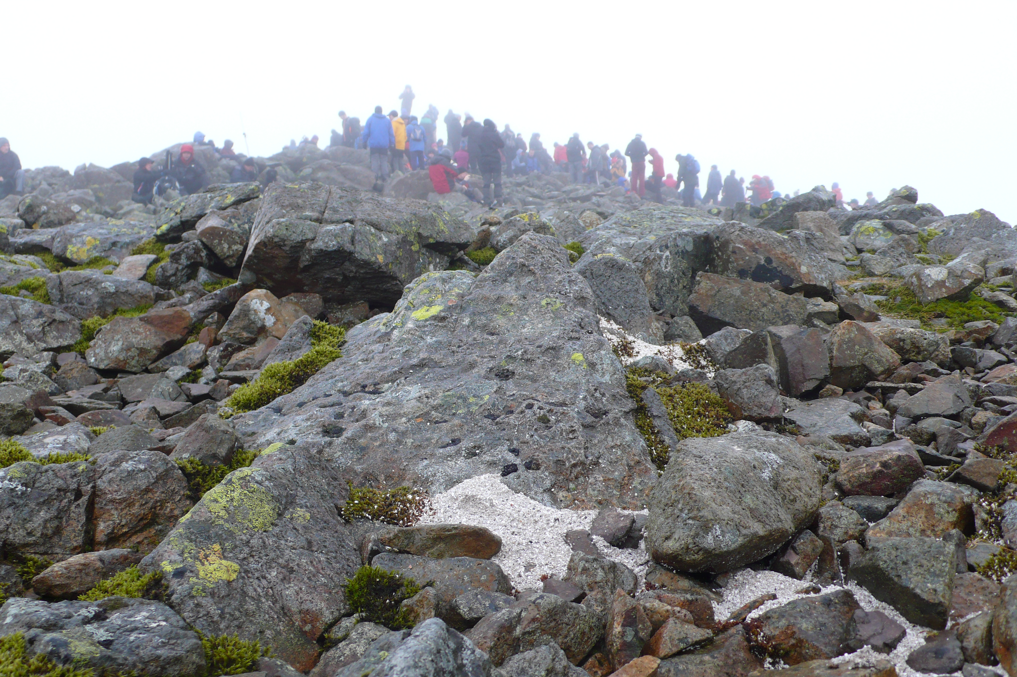 After thought…It is interesting to note that as I stood in the misty silence on Gable’s summit around me and amongst the feet of the gathered throng were scattered people’s ashes. Should archaeologists come to investigate these cairns and summits one wonders what interpretation they may draw from the stratified layer of cremated bone from the 21st Century should it survive; Burial Cairns?