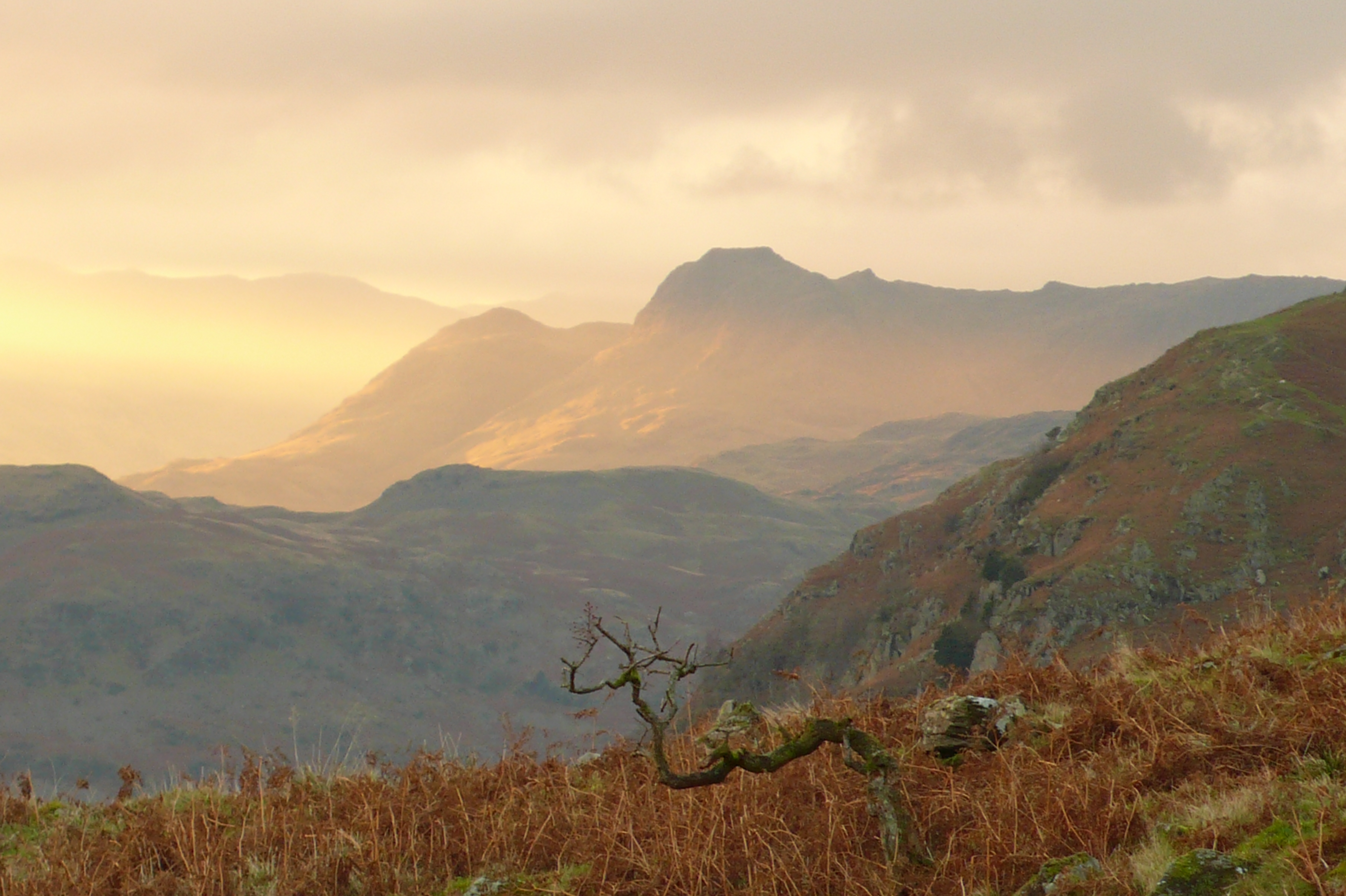 I am reminded of mountain burials as I record a cairn-field, which is surely a cemetery, set in a sheltered hollow high above Rydal; a locale rich in prehistoric rock art. One ponders on the connection between the two, both set in an elevated spot with fine views over Rydal Water to the distant Langdale Pikes; surely as good a final resting place as anyone could wish for.